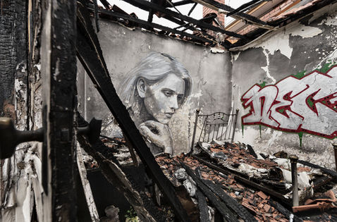 Exploring the synergetic relationship between beauty and decay, new and old, wanted and unwanted, the exhibition’s show stopper was Rone’s dramatic mural piece, 'The Star Lyric' (named in honour of the building’s past). When the artist started sandblasting the building’s rear wall he unwittingly uncovered a 100-year-old tromp l’loeil which he then restored and integrated into the new mural work.