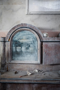 Researching the Gallery’s collection I happened upon Florence Royce’s works. I loved the muted tones of her painted ceramics. They spoke to what I often try to represent: a fading beauty. Building on the reception room concept, I wanted each end of the room to feel different but to have continuity through the space. Light and dark was the answer to this. The sun-faded colours of the lighter end under the glass ceiling contrasting with the soot-stained darker end of the room, the residue of a burnt piano.