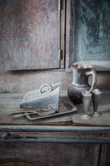 Many of the items of furniture are replicas; some are easy to spot, but others are simply altered originals. One example of a replica is the harp made from wood by Callum Preston. The general shape was cut from a few templates and details were added, including strings and a base. I painted the wood gold, then added a patina to age it to fit the era of the room. The harp is a non-functional replica and the piano is damaged and unplayable, but the musical soundtrack that fills the room, composed by Nick Batterham, is very real.